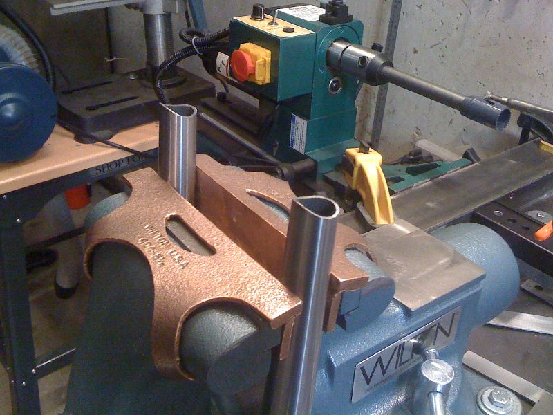 It took me probably 3 hours total. Had I done a better job at estimating the actual fork leg length for the rough cut, it’d have taken less time. I never could’ve done this as quickly as I did without the tubing block fixture thingy and the new Wilton Tradesman 5-1/2″ vise. The jaw width is perfect and the sweet copper soft-jaws are amazing. I never knew how much a good vise made a difference in time and energy. That thing is solid. Highly recommended.