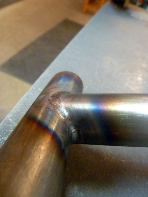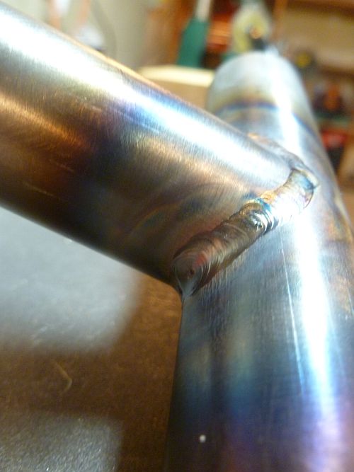I’m by no means ‘there’ yet with the welds. As the pro’s will see any even read this blog, I am still not moving quick enough and/or using too much heat so overheating is still occurring to a certain extent. But some of that is not the weld and just the darker color of the tubes from AS (and the fact I’m not polishing the tubes in these pics before or after welding). This joint is first pass, non-pulsed, just moving the torch and dipping the rod into the puddle…plain ole tig welding.