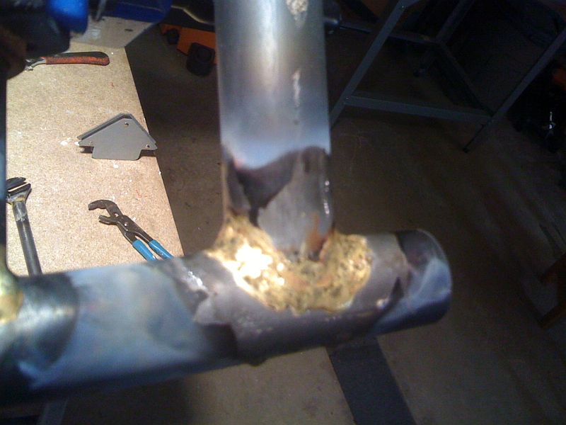 I’ve never put a torch and brass to steel before these first few pictures…so be easy on me! I learned to silver braze the various braze-ons on a bike and that is relatively easy, quick, and fun. But not knowing how to exercise proper heat control, how much oxygen and fuel to make a perfect neutral flame…well…i’m in over my head. I overheated all these joints before they warmed up enough to take the brass. I’m not sure what I’m doing wrong, so if any of you readers can give a bit of advice please comment! I know that practice and experience will only make it better over time.