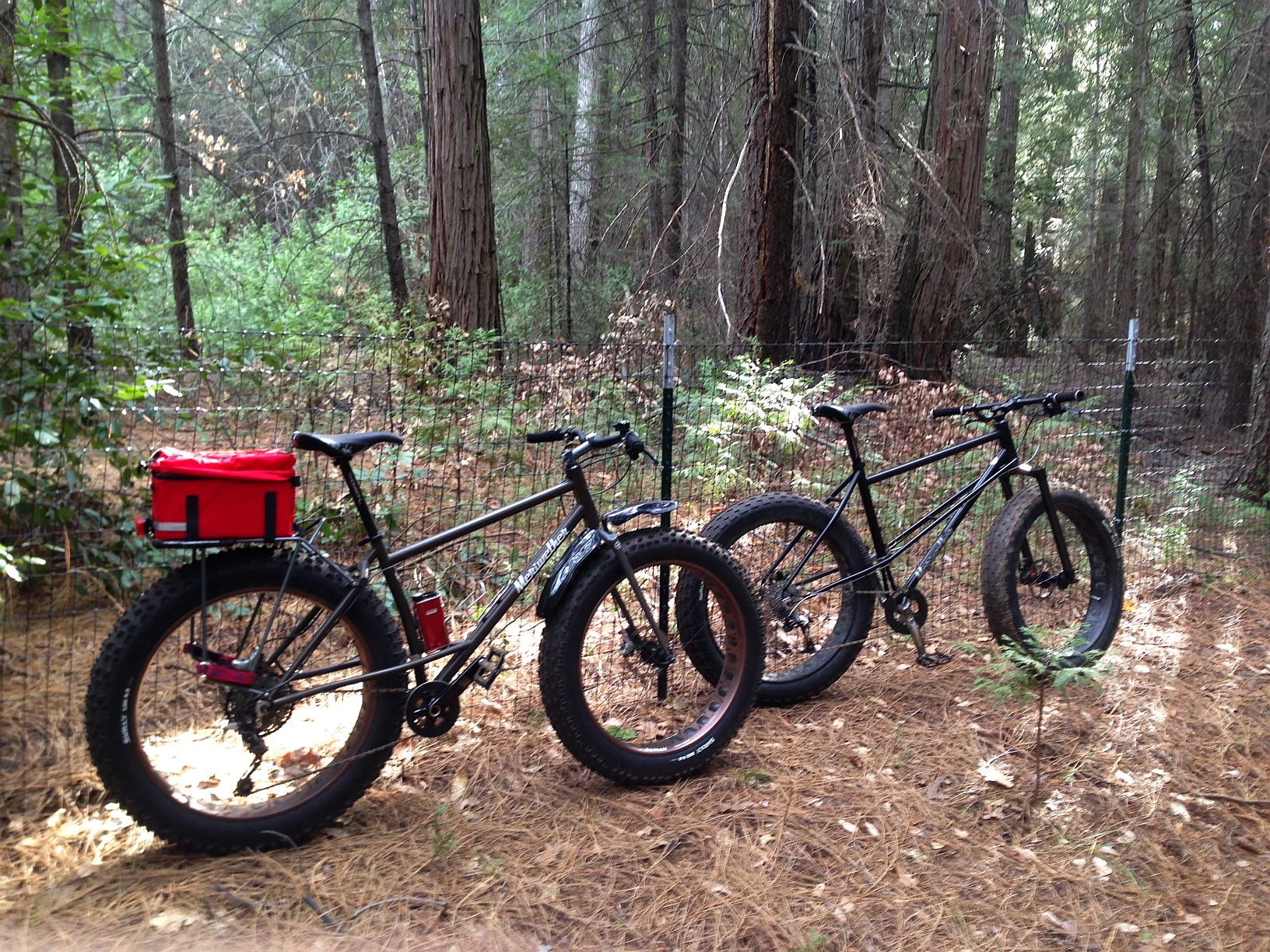 Testing_efatsThese are my two fatbikes. I was going to blab on about how different they are on dirt vs. snow and between eachother on the two mediums, but i decided I need more data. So for now, here are some photos from last weekend’s ride up on Donner Pass. I took both bikes up and rode the same loop twice, mostly (except for the big hike a bike up Andesite Pk).  There’s two ways to go from the North side of Donner Pass — the snowmobile trail to the left, or the ski/hike/snowshoe trail/s to the right.  I headed left as it was probably more packed from the snowmachines.  Also, with the Pacific Crest Trail along the right route, I didn’t know if it was legal to travel on that route with the bike.  A bit slushy and warm for the bike but turned out to be a great few hours of riding.