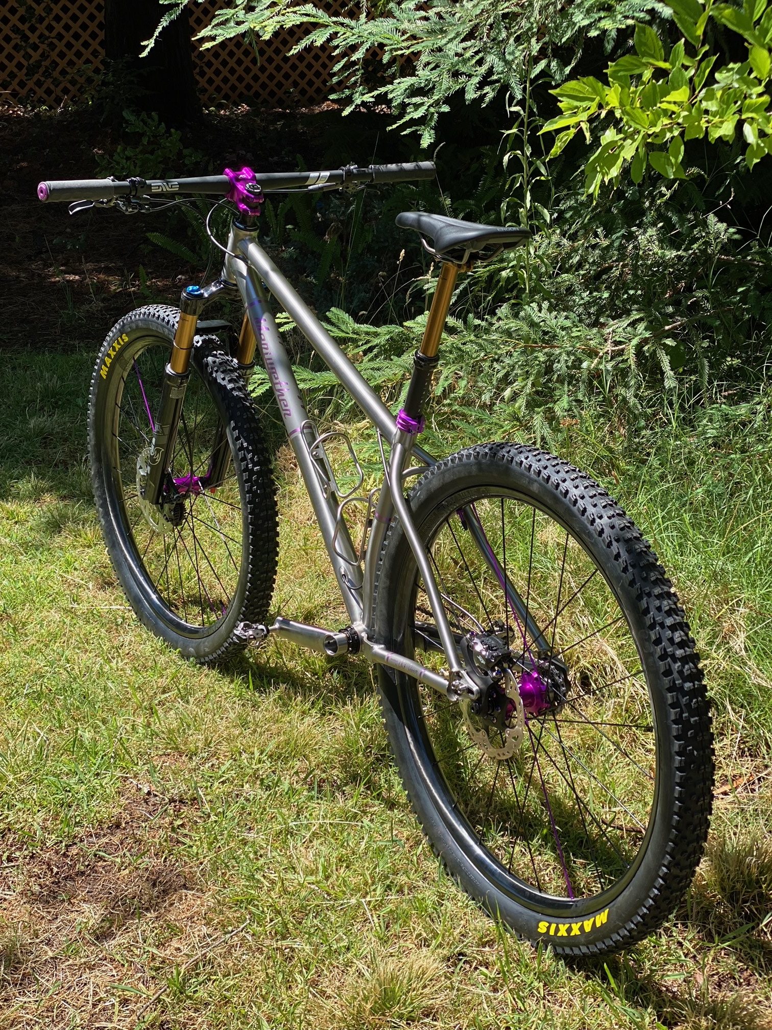 The geometry: 67 deg HTA, 75 deg effective STA, Super short 415mm chainstays with a 2.6″ tire and up to a 2.8 if desired a little farther back, 630mm top tube length, 760mm front center with a Fox 34 120mm travel fork. The purple Industry Nine stem and wheelset started that theme and the beautifully machined Engin collar matched them well. Agave Finishworks did an amazing job with the anodization, totally changing the look and feel of the frame and it really completes the look of the bike. Peter even put stripes on the Cane Creek brushed Ti eeWing cranks. I’m grateful for the opportunity to build such a good looking bike and that Ryan wanted to have my name anodized on the frame too! Thanks again and i hope you enjoy your new adventure buddy!