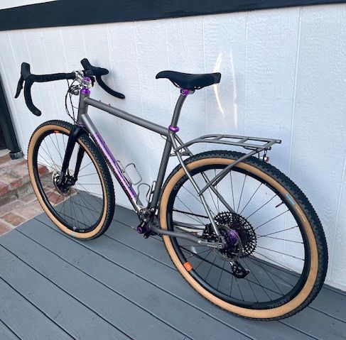 The bike that Whit created speaks for itself in the pictures… We chose to keep the frame itself raw Ti but add purple components and anodizing, with as many “local” parts as possible – White Industries rear hub. Paul Stem, Phil Wood seat clamp, Drust tail light mount, etc etc. My oldest son Walden Reed designed custom logos which combined the 333Fab logo and the Meriwether graphics with a lovely font and front head badge. The final design was executed beautifully by Agave Finish Works in Colorado, and the bike arrived at its home in mid-July 2025. Whit and I were lucky to get the last purple SON dyno hub, and having a bike with all of the braze-ons and build-in lighting means that I can approach my recent retirement from corporate-land with an eye towards multi-day bike wandering either in my back yard or anywhere that promises adventure on excellent trails.